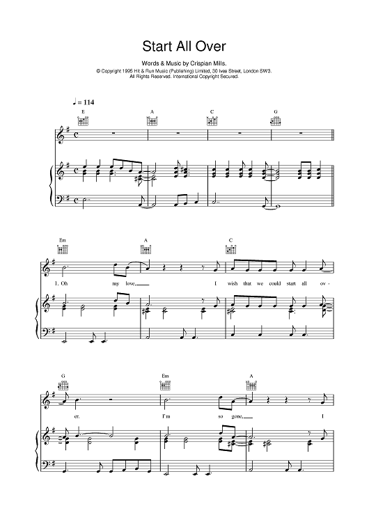 Digital Sheet Music for Start All Over by Kula Shaker, Crispian Mills scored for Piano/Vocal/Chords; id:376268