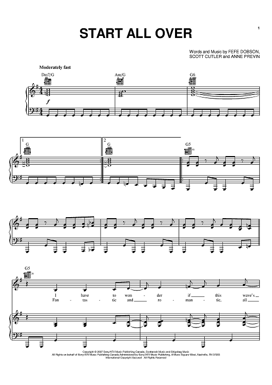 Digital Sheet Music for Start All Over by Scott Cutler, Anne Previn, Miley Cyrus, Fefe Dobson scored for Piano/Vocal/Chords; id:401097