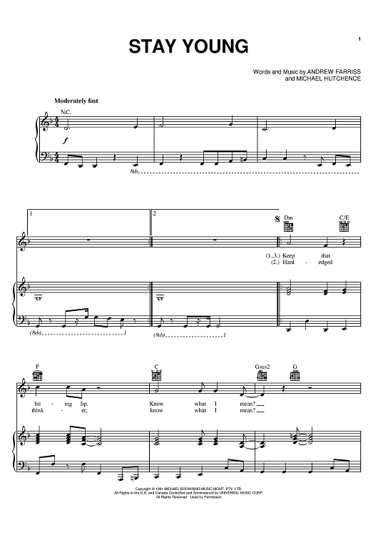 Digital Sheet Music for Stay Young by INXS, Andrew Farriss, Michael Hutchence scored for Piano/Vocal/Chords; id:379172