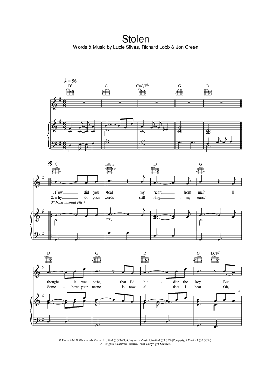 Digital Sheet Music for Stolen by Jon Green, Richard Lobb, Lucie Silvas scored for Piano/Vocal/Chords; id:397017