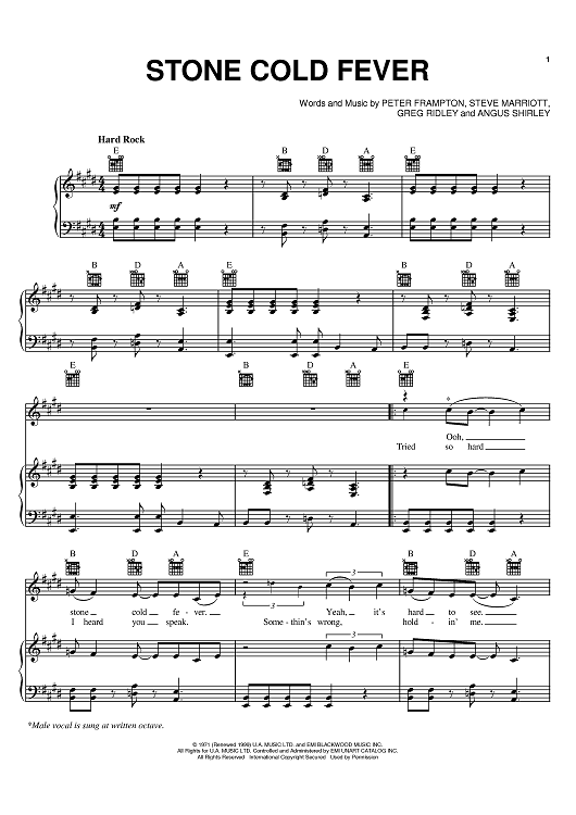 Digital Sheet Music for Stone Cold Fever by Peter Frampton, Steve Marriott, Greg Ridley, Angus Shirley scored for Piano/Vocal/Chords; id:383793