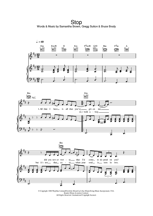 Digital Sheet Music for Stop by Samantha Brown, Gregg Sutton, Bruce Brody, Jamelia scored for Piano/Vocal/Chords; id:385823