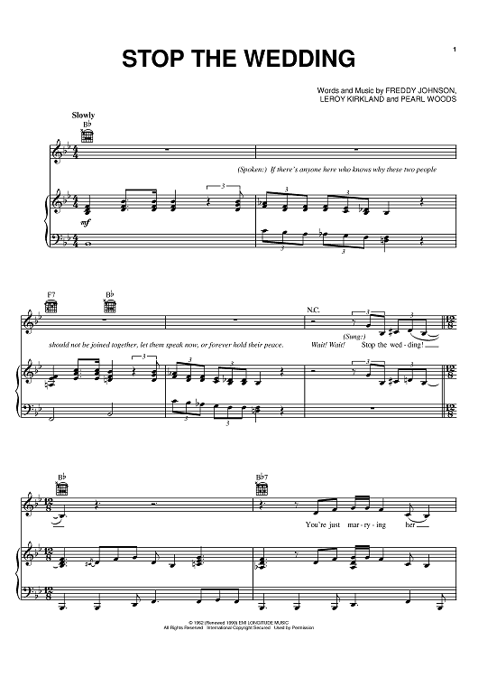 Digital Sheet Music for Stop The Wedding by Pearl Woods, Leroy Kirkland, Etta James, Freddy Johnson scored for Piano/Vocal/Chords; id:384706