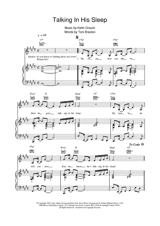 Digital Sheet Music for Talking In His Sleep by Toni Braxton scored for Piano/Vocal/Chords; id:376347