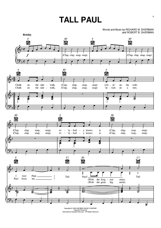 Digital Sheet Music for Tall Paul by Richard M. Sherman, Robert B. Sherman, The Chordettes, Annette Funicello scored for Piano/Vocal/Chords; id:395170