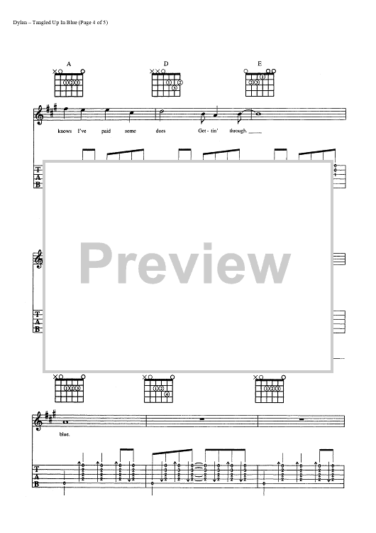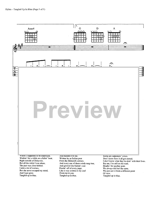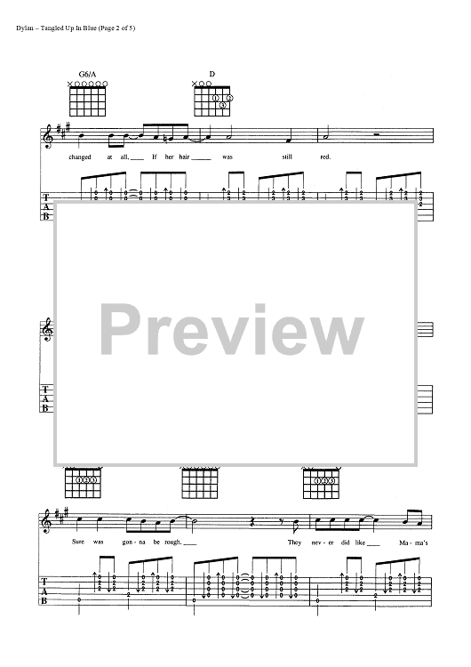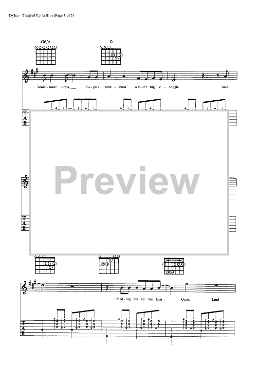 Digital Sheet Music for Tangled Up in Blue by Bob Dylan scored for Guitar Tab/Vocal/Chords; id:445405