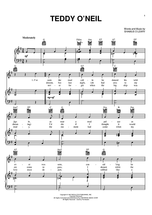 Digital Sheet Music for Teddy O'Neil by Shamus O'Leary scored for Piano/Vocal/Chords; id:393726