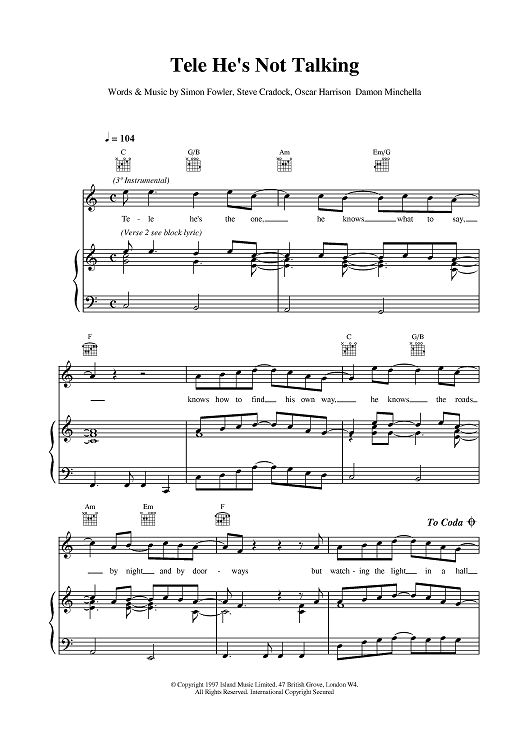 Digital Sheet Music for Tele He's Not Talking by Steve Cradock, Simon Fowler, Oscar Harrison, Ocean Colour Scene scored for Piano/Vocal/Chords; id:379852