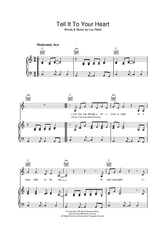 Digital Sheet Music for Tell It To Your Heart by Lou Reed scored for Piano/Vocal/Chords; id:401902