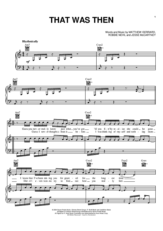 Digital Sheet Music for That Was Then by Matthew Gerrard, Robbie Nevil, Jesse McCartney scored for Piano/Vocal/Chords; id:384096