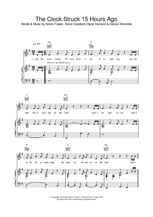 Digital Sheet Music for The Clock Struck 15 Hours Ago by Steve Cradock, Simon Fowler, Oscar Harrison, Damon Minchella, Ocean Colour Scene scored for Piano/Vocal/Chords; id:379805
