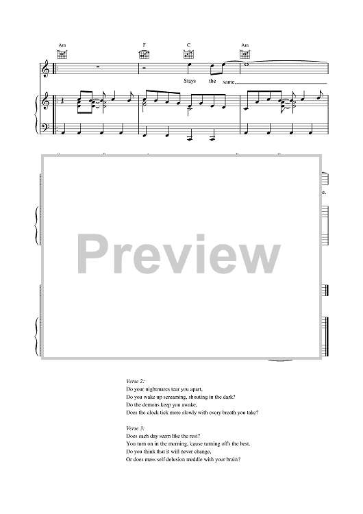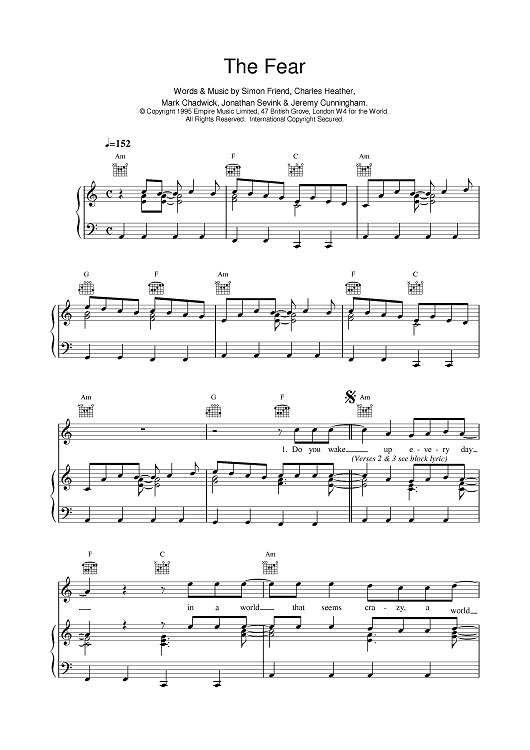 Digital Sheet Music for The Fear by Charles Heather, Simon Friend, The Levellers, Jon Sevink, Mark Chadwick, Jeremy Cunningham scored for Piano/Vocal/Chords; id:379761
