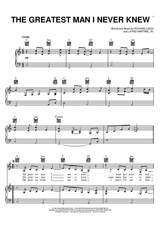 Digital Sheet Music for The Greatest Man I Never Knew by Reba McEntire, Richard Leigh, Layng Martine Jr. scored for Piano/Vocal/Chords; id:387871