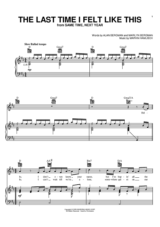 Digital Sheet Music for The Last Time I Felt Like This by Marvin Hamlisch, Alan Bergman, Marilyn Bergman, Johnny Mathis, Jane Olivor scored for Piano/Vocal/Chords; id:382733