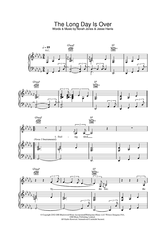 Digital Sheet Music for The Long Day Is Over by Jesse Harris, Norah Jones scored for Piano/Vocal/Chords; id:382642