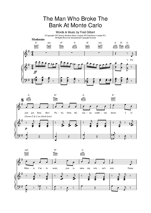 Digital Sheet Music for The Man Who Broke The Bank At Monte Carlo by Fred Gilbert scored for Piano/Vocal/Chords; id:379885