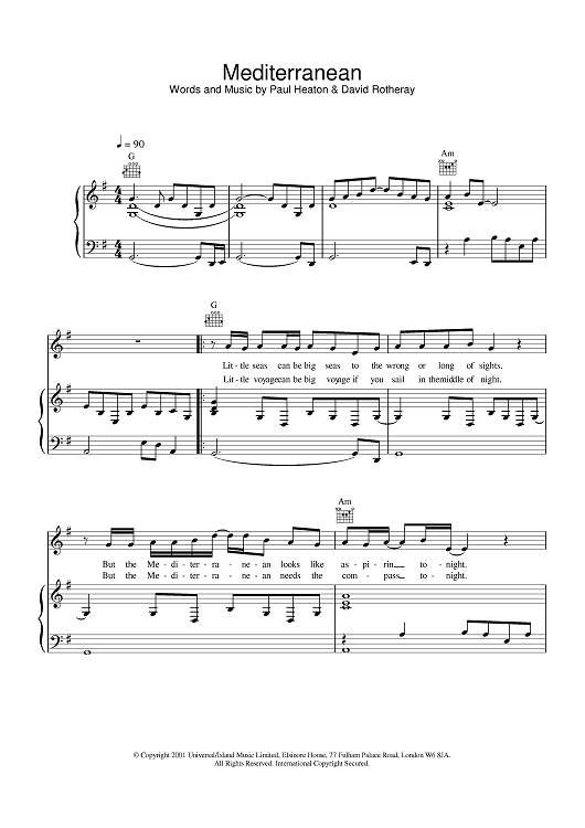 Digital Sheet Music for The Mediterranean by The Beautiful South scored for Piano/Vocal/Chords; id:377518