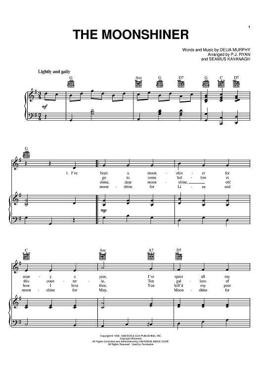 Digital Sheet Music for The Moonshiner by Seamus Kavanagh, Delia Murphy, P.J. Ryan scored for Piano/Vocal/Chords; id:393725