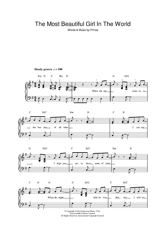 Digital Sheet Music for The Most Beautiful Girl In The World by Prince scored for Piano/Vocal/Chords; id:393523