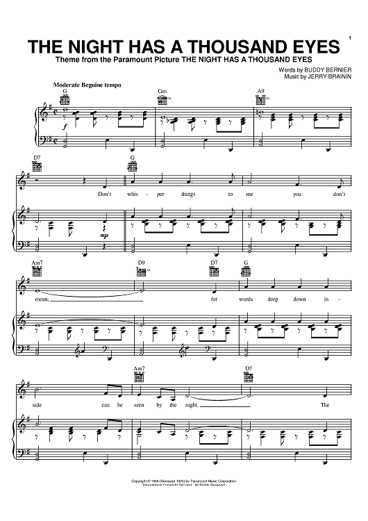 Digital Sheet Music for The Night Has A Thousand Eyes by Buddy Bernier, Jerry Brainin scored for Piano/Vocal/Chords; id:392016