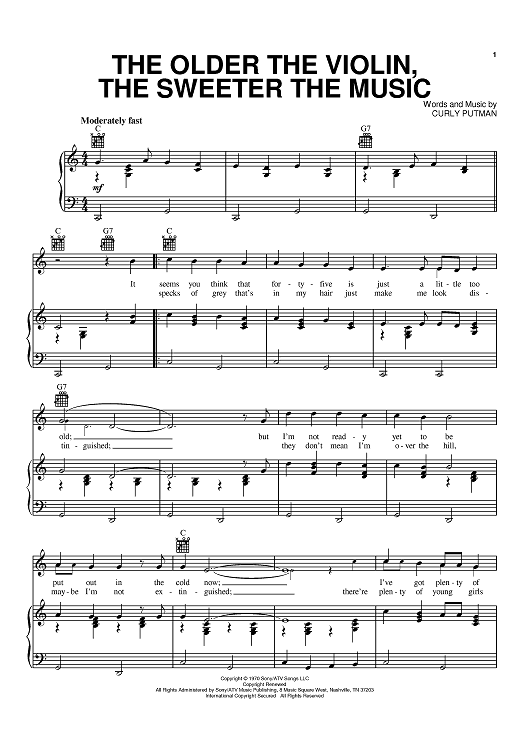 Digital Sheet Music for The Older The Violin, The Sweeter The Music by Hank Thompson, Curly Putman scored for Piano/Vocal/Chords; id:391478