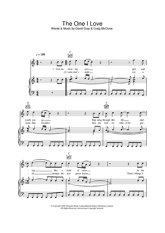 Digital Sheet Music for The One I Love by David Gray, Craig McClune scored for Piano/Vocal/Chords; id:386395