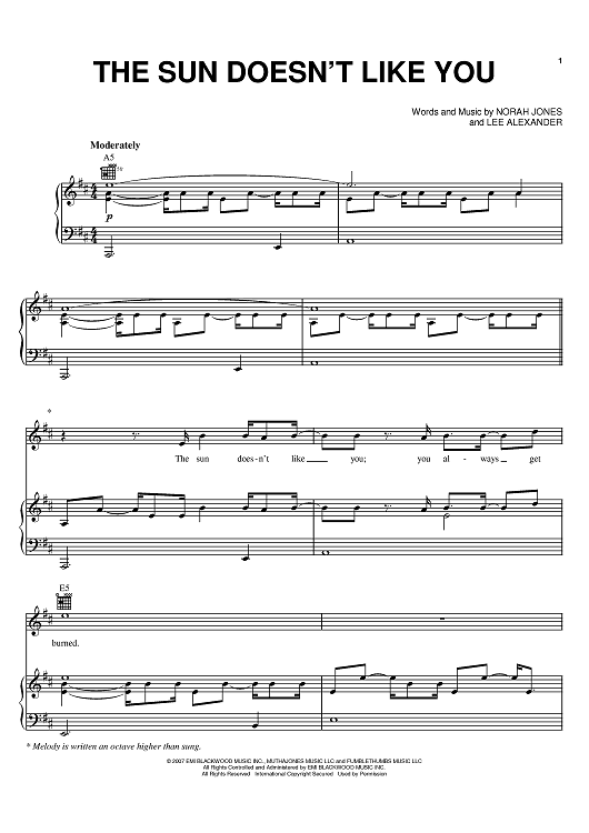 Digital Sheet Music for The Sun Doesn't Like You by Norah Jones, Lee Alexander scored for Piano/Vocal/Chords; id:397576