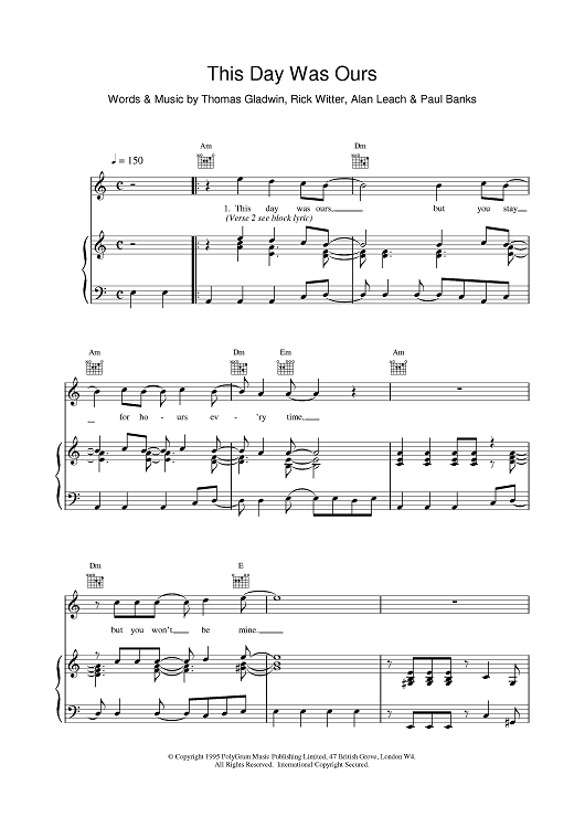 Digital Sheet Music for This Day Was Ours by Thomas Gladwin, Alan Leach, Shed Seven, Rick Witter, Paul Banks scored for Piano/Vocal/Chords; id:379756