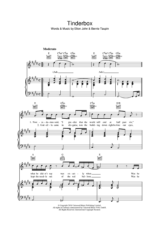Digital Sheet Music for Tinderbox by Elton John, Bernie Taupin scored for Piano/Vocal/Chords; id:393636