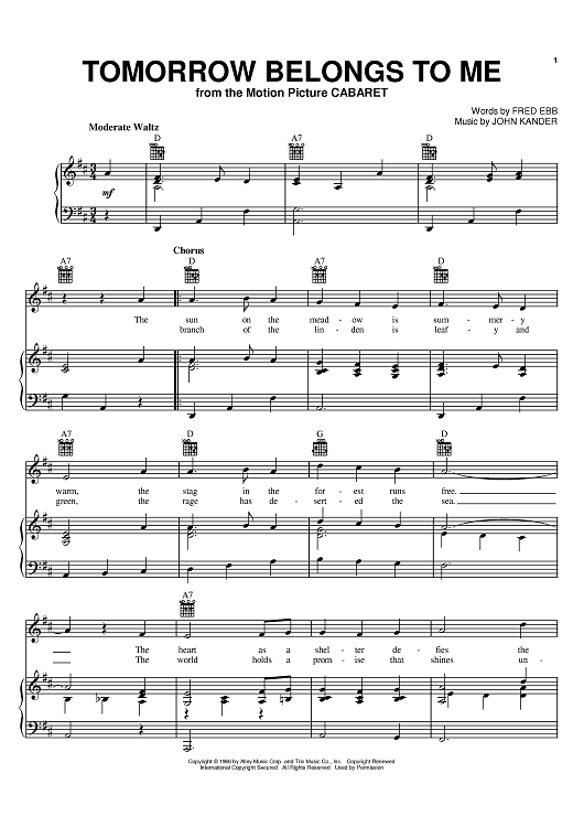 Digital Sheet Music for Tomorrow Belongs To Me by John Kander, Fred Ebb scored for Piano/Vocal/Chords; id:384796