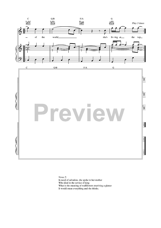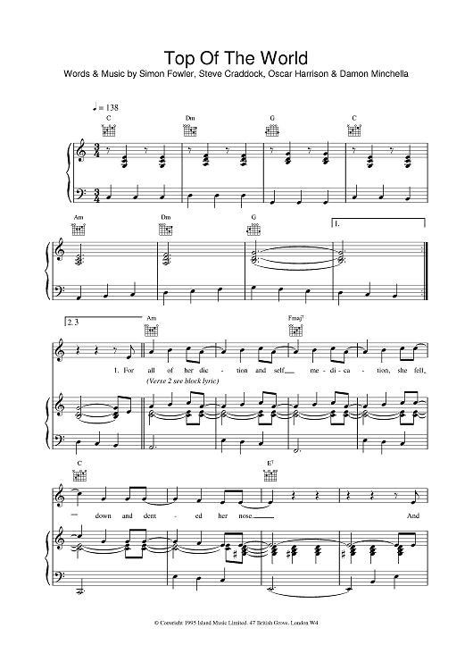 Digital Sheet Music for Top Of The World by Steve Cradock, Simon Fowler, Oscar Harrison, Damon Minchella, Ocean Colour Scene scored for Piano/Vocal/Chords; id:379799