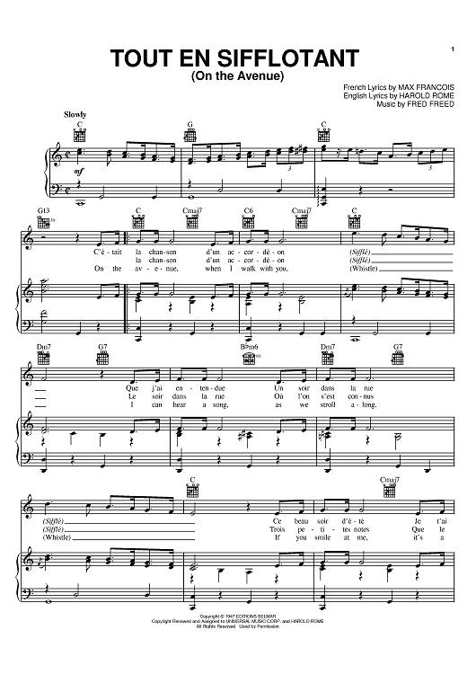 Digital Sheet Music for Tout En Sifflotant (On The Avenue) by Harold Rome, Max Francois, Fred Freed scored for Piano/Vocal/Chords; id:395243
