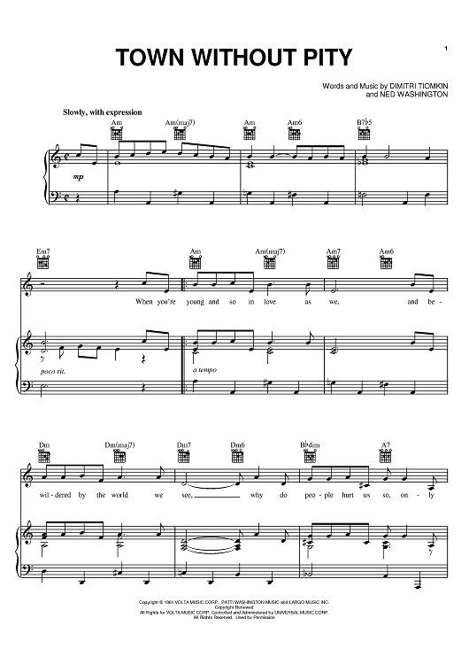 Digital Sheet Music for Town Without Pity by Dimitri Tiomkin, Ned Washington, Gene Pitney, Ronnie Montrose scored for Piano/Vocal/Chords; id:381637