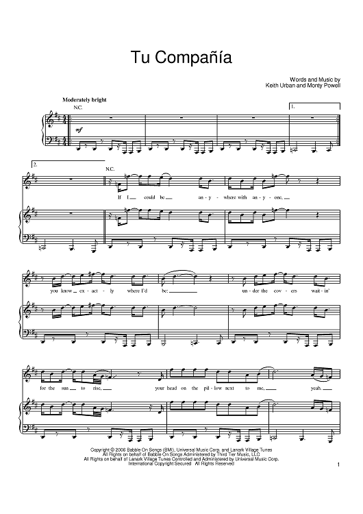 Digital Sheet Music for Tu Compania by Monty Powell, Keith Urban scored for Piano/Vocal/Chords; id:399121