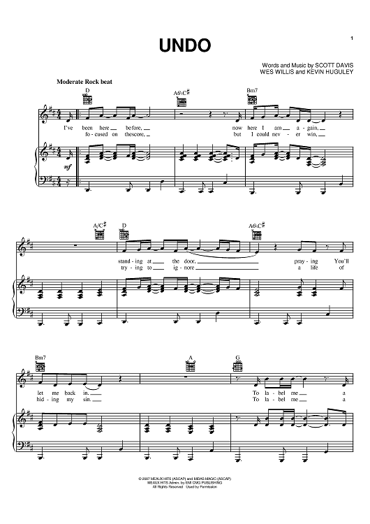 Digital Sheet Music for Undo by Scott Davis, Wes Willis, Kevin Huguley, Rush of Fools scored for Piano/Vocal/Chords; id:402768