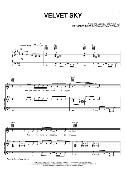 Digital Sheet Music for Velvet Sky by Henry Garza, Joey Garza, Ringo Garza, Los Lonely Boys, Kevin Wommack scored for Piano/Vocal/Chords; id:380564
