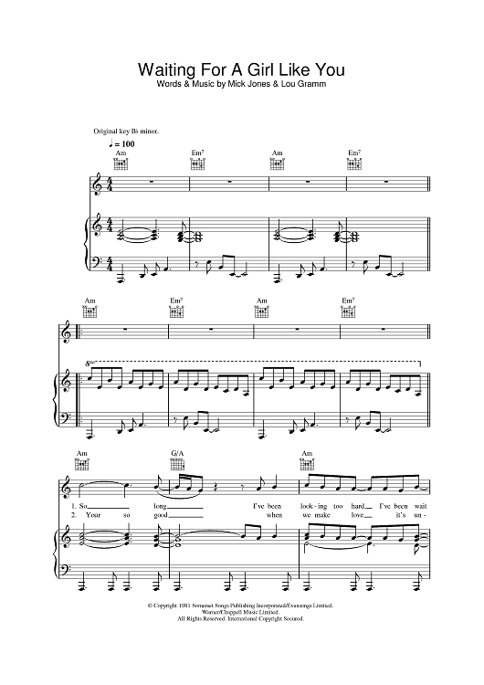 Digital Sheet Music for Waiting For A Girl Like You by Foreigner, Lou Gramm, Mick Jones scored for Piano/Vocal/Chords; id:389171