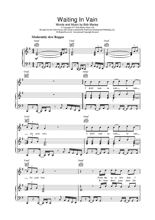 Digital Sheet Music for Waiting In Vain by Bob Marley scored for Piano/Vocal/Chords; id:377982