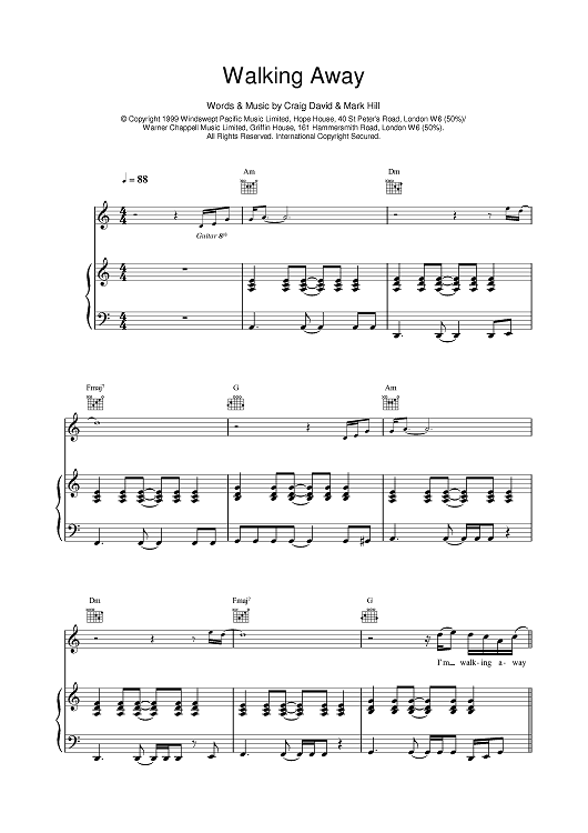 Digital Sheet Music for Walking Away by Craig David, Mark Hill scored for Piano/Vocal/Chords; id:377163