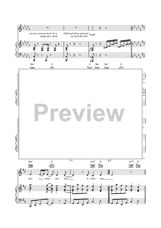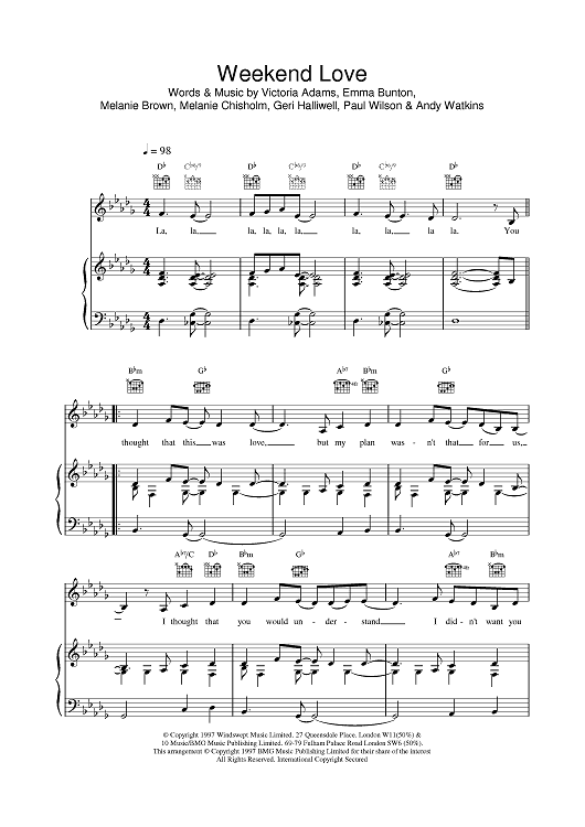 Digital Sheet Music for Weekend Love by Emma Bunton, Melanie Brown, Victoria Adams, Spice Girls scored for Piano/Vocal/Chords; id:382578