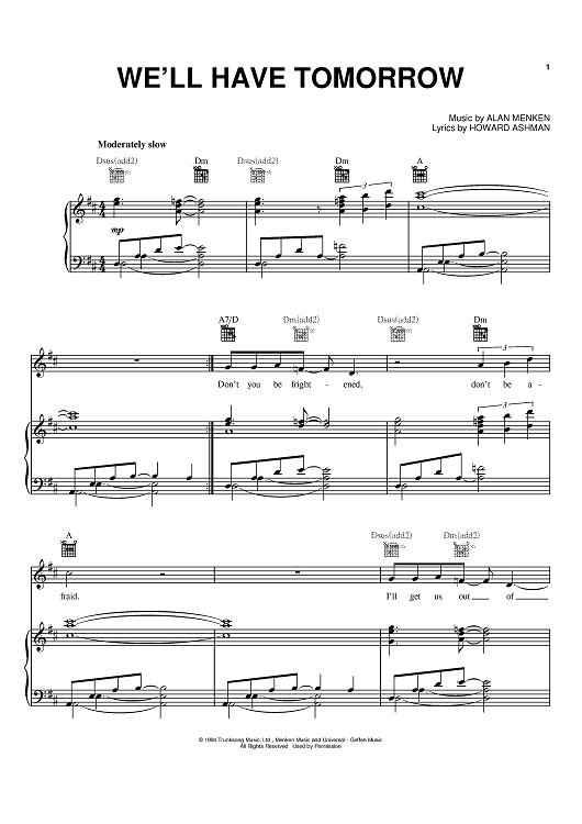Digital Sheet Music for We'll Have Tomorrow by Alan Menken, Howard Ashman scored for Piano/Vocal/Chords; id:374870