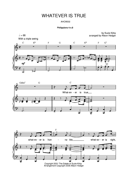 Digital Sheet Music for Whatever Is True by Alison Hedger, Suzie Kirby scored for Piano/Vocal/Chords; id:391595