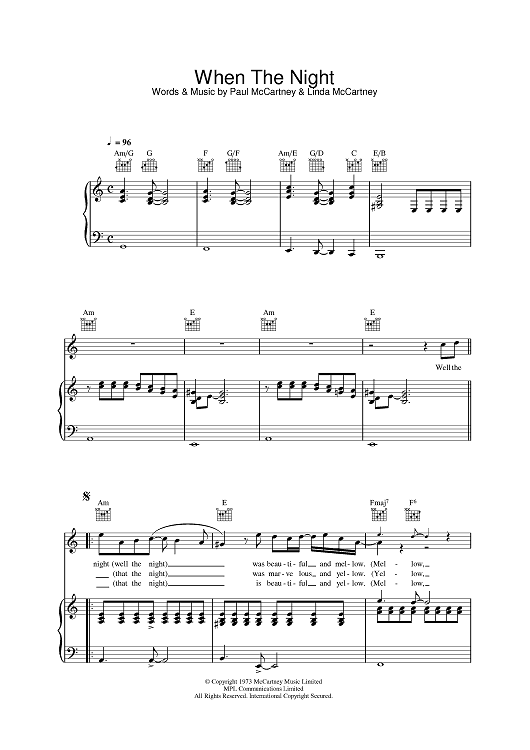 Digital Sheet Music for When The Night by Paul McCartney, Linda McCartney scored for Piano/Vocal/Chords; id:389231