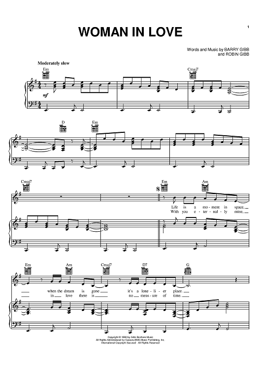 Digital Sheet Music for Woman In Love by Barry Gibb, Robin Gibb, Barbra Streisand scored for Piano/Vocal/Chords; id:383924
