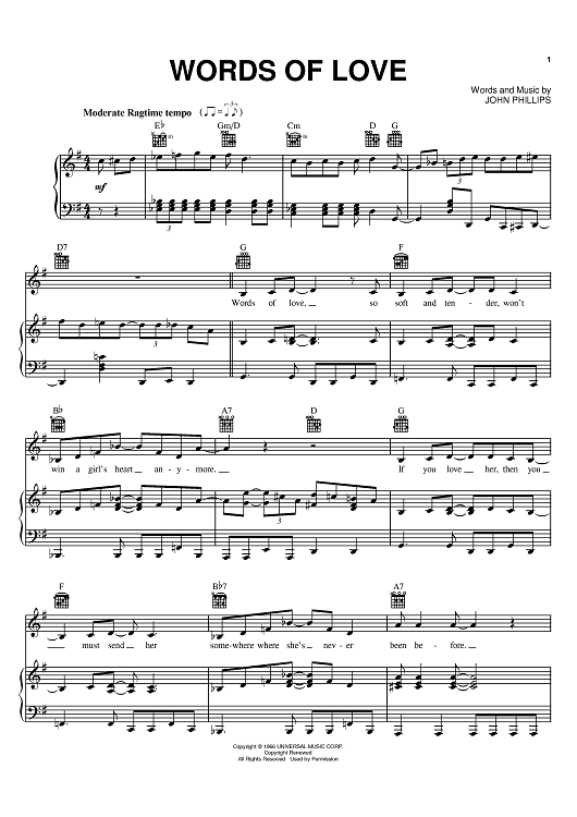 Digital Sheet Music for Words Of Love by The Mamas and The Papas, John Phillips scored for Piano/Vocal/Chords; id:381549