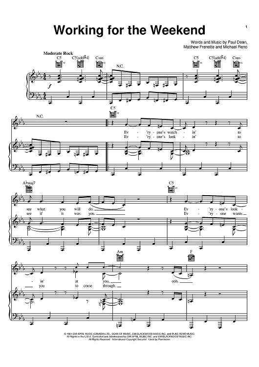 Digital Sheet Music for Working For The Weekend by Paul Dean, Matthew Frenette, Loverboy, Michael Reno scored for Piano/Vocal/Chords; id:374528