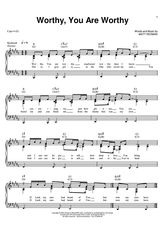 Digital Sheet Music for Worthy, You Are Worthy by Matt Redman scored for Piano/Vocal/Chords; id:393817