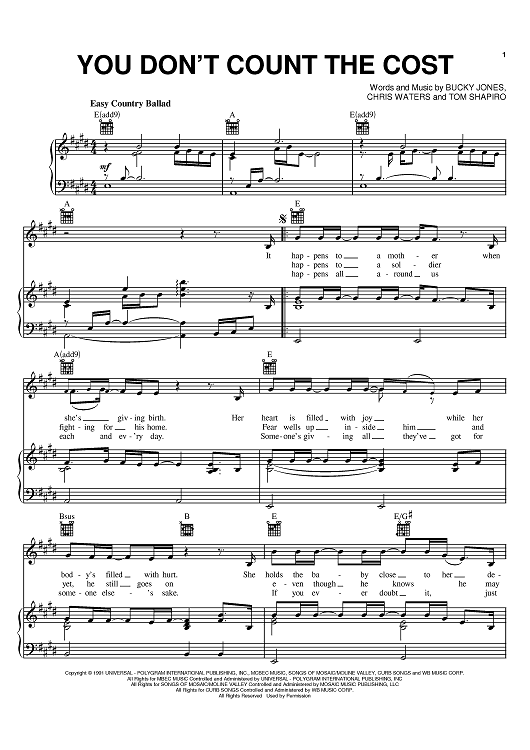 Digital Sheet Music for You Don't Count The Cost by Billy Dean, Chris Waters, Bucky Jones, Tom Shapiro scored for Piano/Vocal/Chords; id:381941