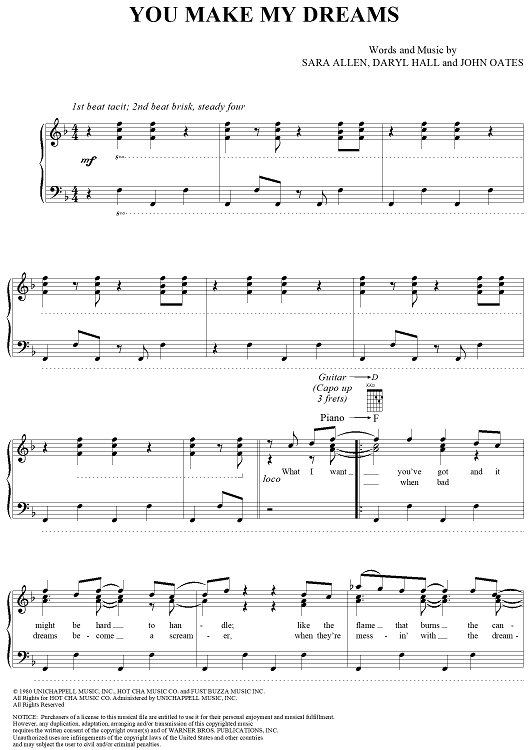 Digital Sheet Music for You Make My Dreams by Daryl Hall, John Oates, Sara Allen scored for Piano/Vocal/Chords; id:293671
