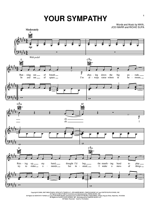 Digital Sheet Music for Your Sympathy by Mika, Jodi Marr, Richie Supa scored for Piano/Vocal/Chords; id:397512